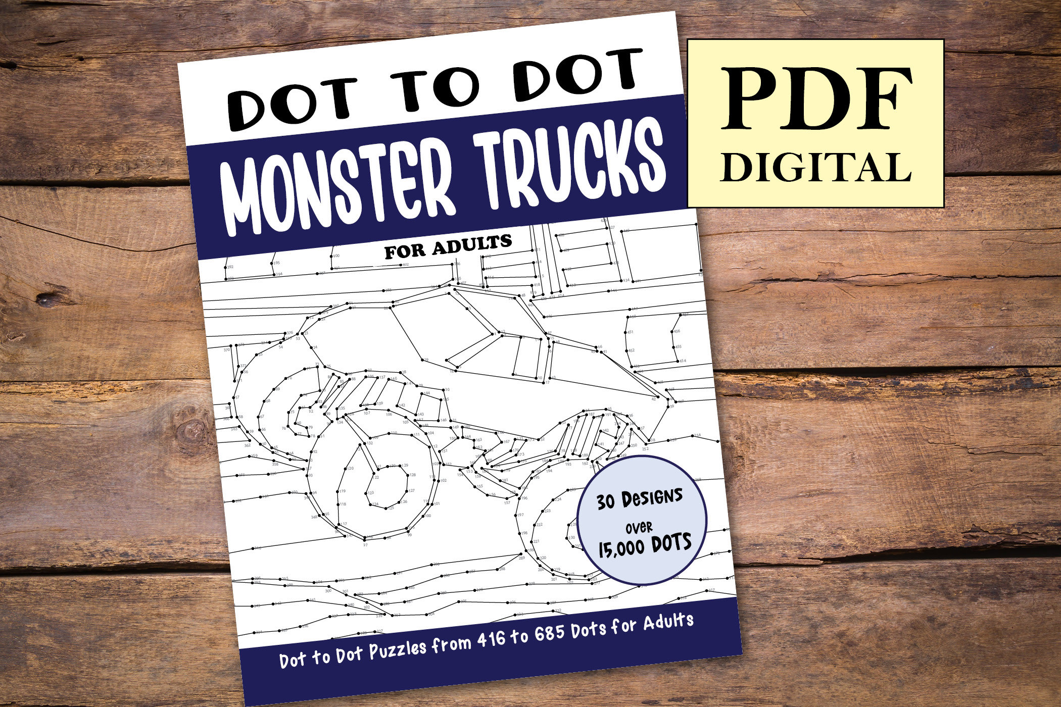 Monster Trucks Dot to Dot Book for Adults with over 15000 dots. This book contains 30 Unique Monster Trucks Dot to Dot Pages.