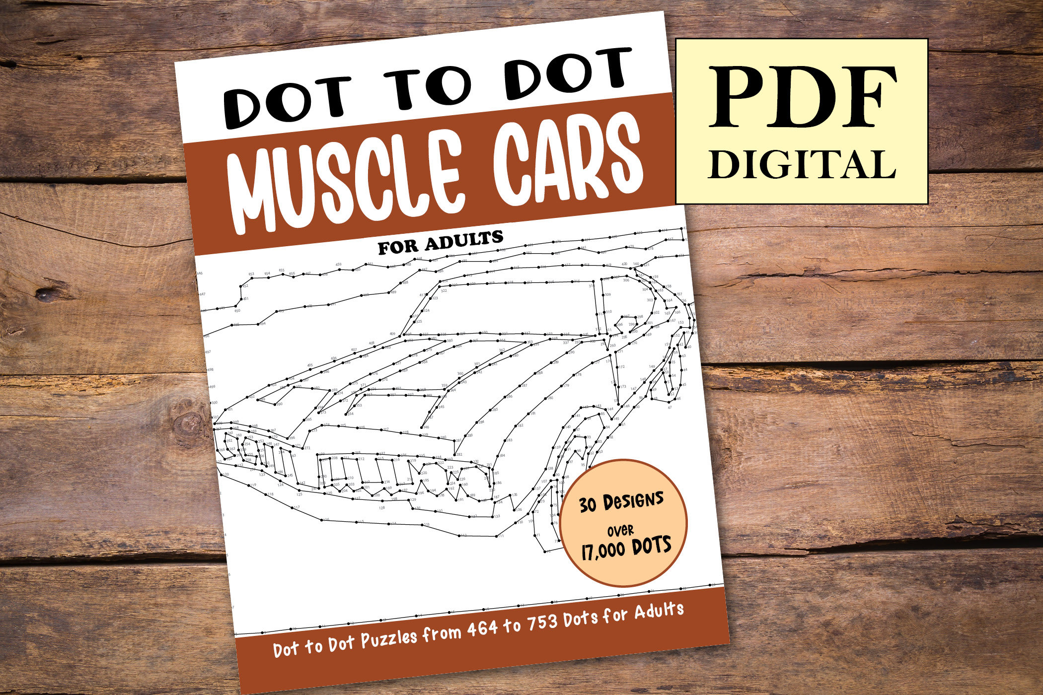 Muscle Cars Dot to Dot Book for Adults with over 17000 dots. This book contains 30 Unique Muscle Cars Dot to Dot Pages.