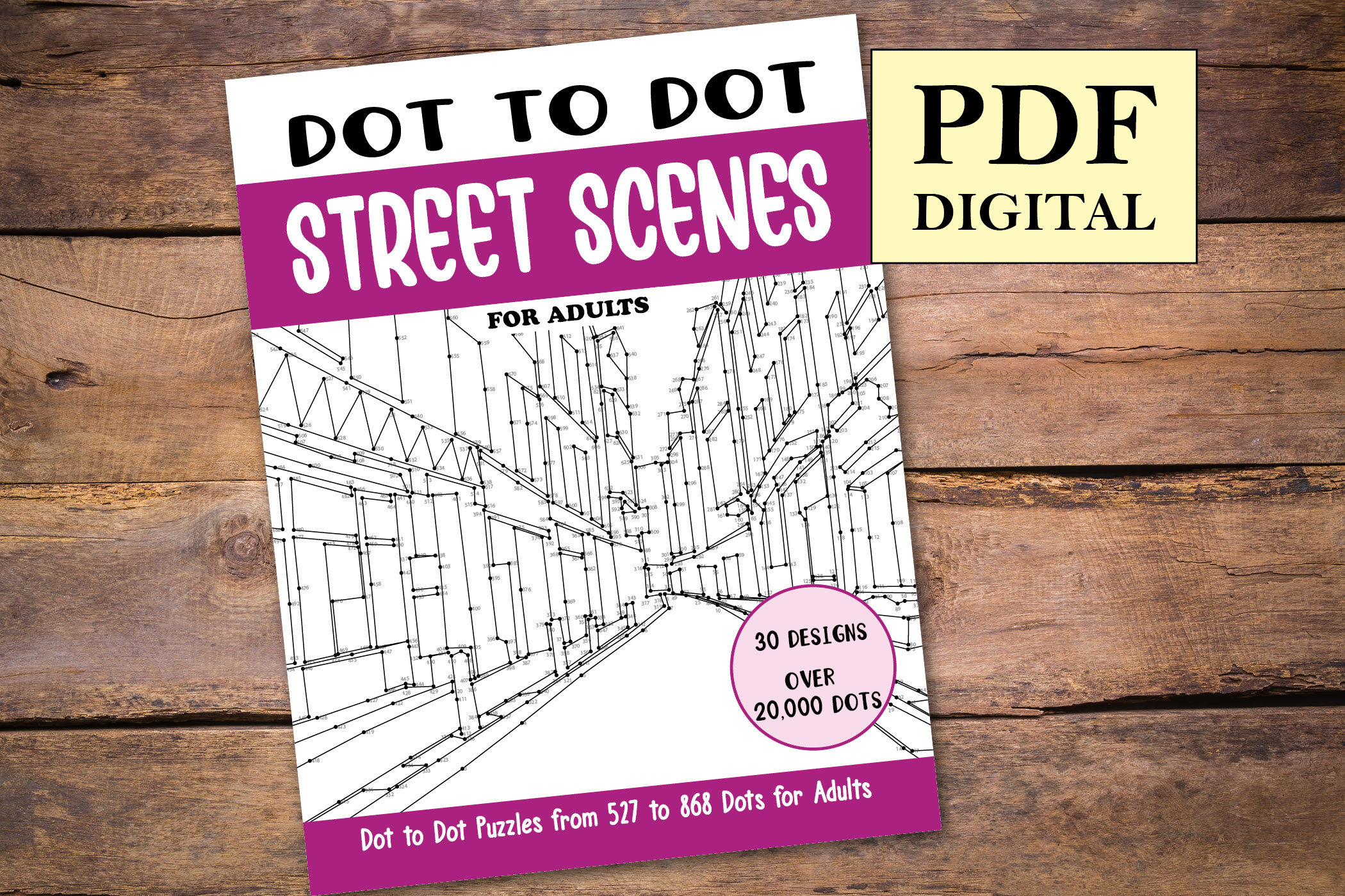 Street Scenes Dot to Dot Book for Adults with over 20000 dots. This book contains 30 Unique Street Scenes Dot to Dot Pages.